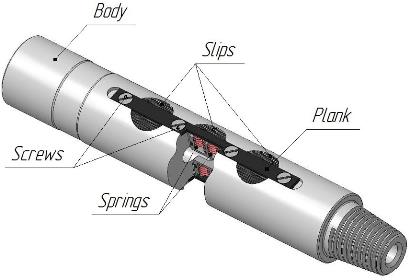 The Hydraulic Tubing Anchor consists of body, spring-fed slips (12 springs and 6 slips) retained by planks (2 pcs) secured with screws (9 pcs) and seals (6 pcs). The anchor is installed immediately after the mud motor. Increasing the flow at the surface generates a back pressure at the tool (chamber), which activates the slip mechanism and sets the slips against the tubing wall. With circulation decrease, the pressure drops and slips retracts away inside the tool body (in running position).